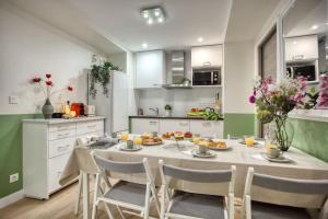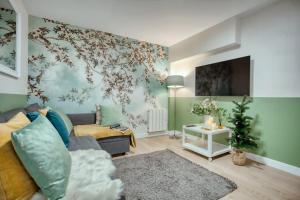The apartment accommodates guests with three bedrooms and two bathrooms, each equipped with showers. The living area features a flat-screen TV and free Wi-Fi throughout the space. A fully equipped kitchen includes a dishwasher, oven, refrigerator, coffee machine, electric kettle, and washing machine. Additional furnishings such as a sofa bed and wardrobe provide practical storage options.