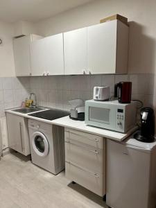 The apartment features one bedroom equipped with a wardrobe and feather pillows, alongside a living room that includes a sofa bed and flat-screen TV. The kitchen comes with appliances such as a microwave, toaster, tea and coffee maker, supporting self-catering stays. A bathroom contains a shower along with toiletries like shampoo, conditioner, soap, and shower cap.