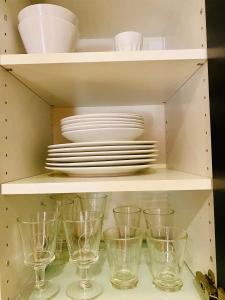 This apartment features a private entrance leading to a living space with hardwood flooring, a wardrobe, and a fan. The fully equipped kitchenette includes a microwave, stovetop, and dishwasher for convenient meal preparation. The bathroom provides a walk-in shower without steps along with soap and a hairdryer.