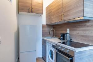В апартаментах предусмотрена гостиная с раскладным диваном и телевизором с плоским экраном, а также оборудованная кухня с холодильником, микроволновой печью, обеденной зоной и столом. В ванной комнате имеется душевая кабина, полотенца и фен. Для удобства гостей предусмотрены отопление и стиральная машина.