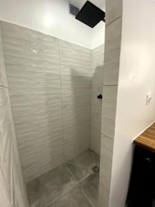 The bathroom includes a walk-in shower and basic linens are available upon request for an additional fee. Throughout the apartment, wooden floors add warmth to the inviting atmosphere.