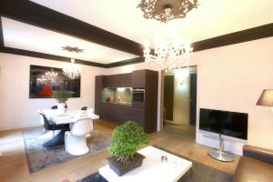 Prostorný apartmán nabízí dvě ložnice a koupelnu vybavenou sprchovým koutem typu walk-in. K dispozici je plně vybavená kuchyň s troubou i myčkou nádobí a také pračka pro vaše pohodlí. Součástí obývacího prostoru je rozkládací pohovka a televizor s plochou obrazovkou včetně kabelových kanálů. Podlahy jsou z masivního dřeva nebo parketové - vše doplněno o zvukovou izolaci pro klidný pobyt i soukromý vstup do bytu.