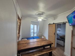Additional amenities include heating paired with a fan to maintain fresh air circulation throughout the space, plus free Wi-Fi available both in the apartment and the shared lounge area nearby. Entertainment options include a flat-screen TV.