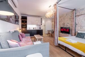 Inside, you’ll find one comfortable bedroom alongside a living area featuring a sofa bed and a flat-screen TV. The kitchen comes fully equipped with modern appliances including a refrigerator, dishwasher, and oven-ideal for preparing meals at your convenience. The bathroom offers a shower and hairdryer, fresh towels and linens are provided for your stay.
