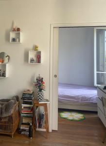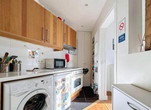 Inside, you’ll find a cozy bedroom separate from the living area, which includes a compact kitchen equipped with all essentials for preparing meals. A fully fitted bathroom complements the space, while added conveniences like heating and a washing machine ensure comfort throughout your stay. Large windows frame serene garden views that bring a touch of nature into the heart of Paris.