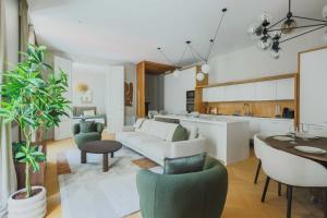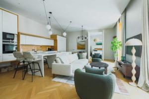 La cocina está totalmente equipada con horno, lavavajillas, hervidor eléctrico y máquina para preparar café. La zona destinada al descanso está separada del área culinaria para crear ambientes diferenciados. También incluye una lavadora-secadora junto con un tendedero para ropa.
