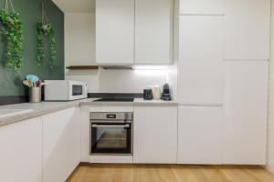 The studio includes a fully equipped kitchen with a dishwasher and oven, complemented by kitchenware for meal preparation. The living area features heating, a sofa bed, and seating space. Guests can watch TV or use the washing machine available inside the unit. The bathroom provides either a bathtub or shower along with soap and a hairdryer.