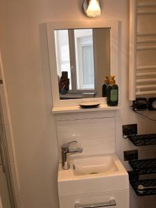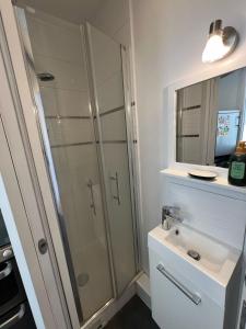 Inside, you’ll find a cozy bedroom alongside a bathroom and a fully equipped kitchen ready for your culinary needs. The living area features underfloor heating and a flat-screen TV, with windows framing pleasant views of the neighborhood.