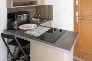 A compact kitchenette offers everything needed to prepare meals: an oven, stovetop, cookware set, electric kettle plus coffee and tea makers-perfect for enjoying homemade breakfasts or light dinners after exploring the city.