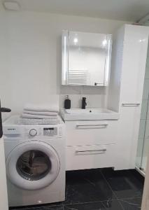The apartment comprises a living room with a sofa bed and flat-screen TV, an equipped kitchen with dining area, and a bathroom featuring a shower. Guests benefit from free Wi-Fi throughout the accommodation, heating, a washing machine, ironing facilities, and both feather and non-feather pillows on the bed.