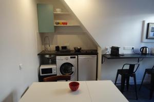 The apartment includes a living room with a flat-screen TV and free Wi-Fi throughout the space. The kitchenette comes fully equipped with a stovetop, dishwasher, microwave, refrigerator, and coffee machine. The bathroom is private to guests and features a shower, shampoo, towels, bed linen, hairdryer, and non-feather pillows. Heating is available in the sleeping area which also contains soundproofing for added privacy.