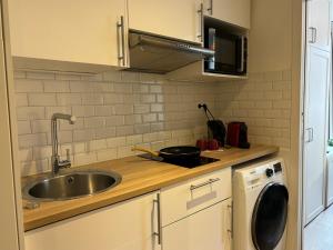 The apartment includes a fully equipped kitchen featuring an oven, microwave, stovetop, and refrigerator. The living area contains a flat-screen TV with streaming services and on-demand movies. A washing machine is available for guest use. The bathroom has a shower and supplies soap, towels, and bed linen are provided.