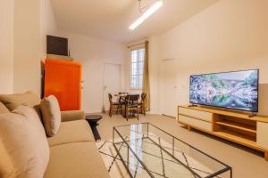 Inside, the apartment features a living room with cable TV and a fully equipped kitchen that includes an oven and microwave. The private bathroom comes with a hairdryer, while towels and bed linens are supplied for your stay. Guests benefit from a desk area, ironing facilities, and provisions for making tea or coffee. The room’s windows face the city, enhancing natural light throughout.