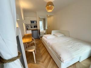 Inside, the fully equipped kitchen includes modern appliances such as a microwave and refrigerator, making meal preparation convenient. The bathroom is stocked with essentials like shampoo, soap, and even a shower cap, complemented by fresh towels and non-feather pillows to ensure restful nights.