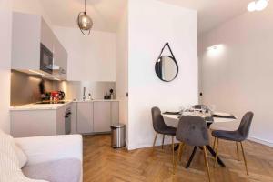 A dedicated dining nook complements the seating space designed for unwinding after busy days exploring the city. Meal delivery services can be arranged directly to your door for added ease. Cleaning schedules are flexible thanks to professional housekeeping available on request or pauseable according to your preference.