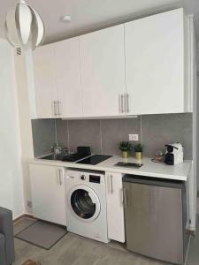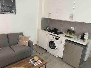The apartment includes one bedroom and a living room with a flat-screen TV. Guests can prepare meals in the equipped kitchen featuring dining facilities and kitchenware including a toaster. The bathroom contains a shower, toiletries such as soap and shampoo, towels, bed linen, and a washing machine. A sofa bed is also available to accommodate additional guests.