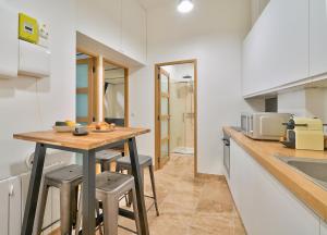 Inside, the apartment features a fully equipped kitchen with an oven, microwave, refrigerator, coffee machine, and electric kettle. The living area includes a TV and free Wi-Fi throughout. The bathroom contains a shower with shampoo provided along with towels. Additional comforts include heating, a fan for air circulation, and a hairdryer.