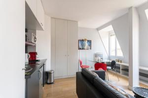 Soukromý vstup vás zavede do světlého obývacího pokoje vybaveného televizí, kde si můžete odpočinout po dni plném objevování Paříže. Kuchyň je samostatná a nabízí vše potřebné - mikrovlnnou troubu, toustovač, lednici i kávovar s rychlovarnou konvicí pro přípravu ranní kávy nebo svačiny podle chuti. Koupelna disponuje sprchovým koutem a sušičem vlasů, nechybí zde ani ručníky a šampon.
