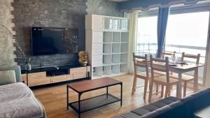 This two-bedroom apartment features an open living area equipped with a flat-screen TV and large windows that frame views of both a peaceful garden and the city skyline. The kitchen is fully fitted with modern appliances including an oven, microwave, and cooktop alongside a dining space for preparing meals comfortably at home. A walk-in shower complements the bathroom facilities, which include an additional separate toilet.
