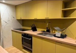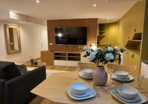This air-conditioned apartment features one bedroom alongside a living area equipped with a flat-screen TV. The kitchen comes fully stocked with modern appliances including an oven and coffee maker to prepare your meals comfortably. The bathroom offers either a shower or bathtub along with essentials such as soap and a hairdryer. Fresh towels and bed linens are provided for your convenience.