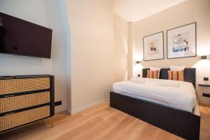 The apartment features a living room furnished with a sofa and equipped with a flat-screen TV that provides streaming services. The fully equipped kitchen includes an oven, microwave, stovetop, and necessary kitchenware for meal preparation. The private bathroom contains both a walk-in shower and bathtub, complemented by provided towels and bed linen.