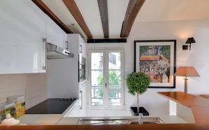 Large windows overlook a tranquil street alongside sweeping views of Parisian rooftops-perfect for unwinding after exploring nearby attractions.