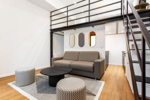 Le coin cuisine entièrement équipé comprend un four traditionnel, un micro-ondes, un grille-pain ainsi qu’une machine à café et une bouilloire électrique accompagnés d’ustensiles et d’un réfrigérateur. Un espace salon avec canapé invite à la détente après une journée parisienne bien remplie.