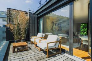 Inside, you’ll find a well-appointed bathroom stocked with towels, shampoo, and a hairdryer for your convenience. The apartment features its own private entrance leading to a charming patio that overlooks the cityscape-a perfect spot to unwind after exploring Paris.