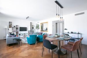 Tento elegantní apartmán se dvěma ložnicemi a terasou nabízí klidné útočiště přímo v srdci Paříže, jen pár kroků od slavného bulváru Champs-Élysées. Z balkonu i terasy se otevírá pohled do zahrady, což vytváří příjemnou atmosféru pro relaxaci po dni stráveném objevováním města.