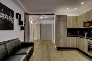 Each apartment features a seating area with a sofa and flat-screen TV alongside a kitchen equipped with a dishwasher, oven, microwave, coffee machine, kettle, and dining space. The private bathroom includes a bathtub and hairdryer while linens and towels are provided. Additional comforts include heating, feather pillows, shampoo, a tumble dryer, clothes drying rack, safety deposit box, convertible sofa bed for extra guests or children’s beds.