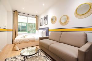 Apartmán nabízí soukromý vstup a výhled do klidného vnitřního dvora. Podlahy jsou pokryté parketami nebo dřevem, což prostoru dodává příjemnou atmosféru. Součástí vybavení je klimatizace i pohodlný kout s krbem a pohovkou pro relaxaci po dni stráveném poznáváním města.