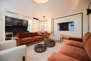 This two-bedroom apartment features two bathrooms equipped with showers and complimentary toiletries for added convenience. A bright living area includes a flat-screen TV, perfect for relaxing after exploring the city. The fully fitted kitchen comes complete with essentials including a microwave, electric kettle, and stovetop alongside a dining space ideal for meals at home.