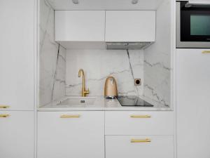 The kitchen is thoughtfully equipped for preparing meals at home, featuring modern appliances such as a dishwasher, microwave, toaster, and an electric cooktop. Fresh linens and towels are provided for your convenience.