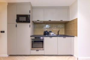 Inside, you’ll find a bright living area with a comfortable sofa bed and a flat-screen TV, ideal for relaxing after a day of sightseeing. The fully equipped kitchen features modern appliances including an oven, microwave, refrigerator, stovetop, coffee maker, and electric kettle-everything needed to prepare meals at your convenience. A dining table with chairs provides a cozy spot to enjoy your food.