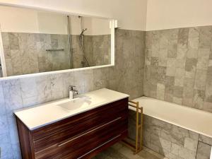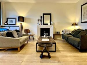The spacious flat includes a fully equipped kitchen with a dishwasher, oven, stovetop, microwave, and refrigerator. The living area is separate from the kitchen. Guests will find towels and bed linen provided along with heating for comfort. The bathroom supplies soap and a hairdryer.