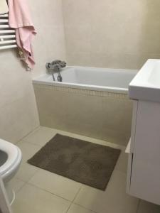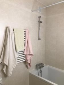 The apartment includes one bedroom with both feather and non-feather pillows, a seating area featuring a sofa bed, and a separate kitchen equipped with an oven, dishwasher, and refrigerator. The bathroom contains a bath along with toiletries like shampoo, soap, towels, and a hairdryer. Entertainment is provided by a flat-screen TV.