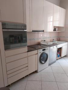The apartment includes two bedrooms and a living area with a sofa bed. The sleeping quarters feature a dressing room and hardwood or parquet flooring. Guests can prepare meals in the fully equipped kitchen that contains an oven, stovetop, microwave, dishwasher, and electric kettle. Laundry needs are met with an on-site washing machine.