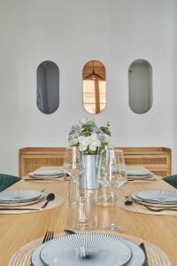 Cada apartamento cuenta con un amplio salón equipado con sofá y zona de descanso, además de un comedor donde encontrarás copas para vino. La cocina dispone de microondas, tostadora, nevera, cafetera y hervidor eléctrico. En el baño hay secador de pelo y lavadora automática.