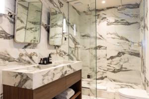 This air-conditioned apartment includes three bedrooms and three bathrooms, with bed linen and towels provided. The living area features a separate fully equipped kitchen with a dishwasher, microwave, refrigerator, kettle, and tumble dryer. Guests can enjoy cable TV in the seating area alongside free Wi-Fi throughout the unit. A desk is available for work needs.