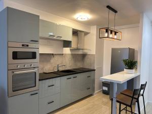 The apartment includes a living room equipped with a flat-screen TV featuring streaming services and pay-per-view channels. The kitchen area contains an oven, microwave, stovetop, and basic kitchenware suitable for meal preparation. The bathroom provides slippers, shampoo, soap, towels, and bed linens. Sleeping arrangements include a sofa bed and can accommodate a crib if needed. Non-smoking rooms are accessible by elevator.