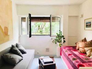 Guests can enjoy a tranquil garden with lush greenery visible from the windows, creating a serene atmosphere. The accommodation features one bedroom alongside a fully equipped kitchen that includes essentials like a microwave and toaster. The bathroom comes with a shower, hairdryer, and washing machine for added convenience. Fresh linens and towels are provided.