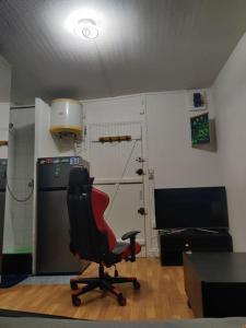 The apartment features a separate bedroom alongside a fully equipped kitchenette complete with a microwave and refrigerator, perfect for preparing your own meals. A shared bathroom includes essentials like shampoo and a hairdryer for your convenience.