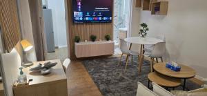 The apartment features one bedroom alongside a bathroom equipped with a walk-in shower and essential toiletries like shampoo. The living area includes a TV with streaming services and an air purifier for added comfort. A kitchenette comes fully fitted with an oven, dishwasher, and dining space, complemented by laundry facilities including a washing machine and drying rack. Guests can enjoy hypoallergenic bedding, fresh towels, and cozy slippers during their stay.