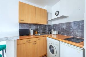 The fully equipped kitchen includes essentials such as a microwave, refrigerator, coffee maker, and kettle-ideal for preparing meals at your leisure-and there’s an inviting dining area right in the room to enjoy them comfortably. Additional amenities include a washing machine and iron to help keep you fresh on longer trips.