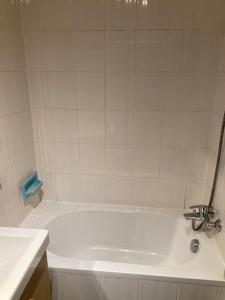 The apartment features one bedroom alongside a spacious living area with a sofa and flat-screen TV for relaxing evenings. The kitchen comes fully equipped with essentials including a refrigerator, microwave, and stovetop to prepare your meals with ease. A bathroom fitted with a bathtub adds to your comfort during your stay.