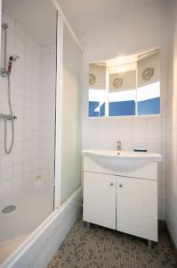 The apartment includes one bedroom with heating controls and can accommodate a crib. It features an en-suite bathroom with a shower. The living area offers a TV and a table for dining or work. The fully equipped kitchen contains a microwave, toaster, coffee machine, and refrigerator for guest convenience.