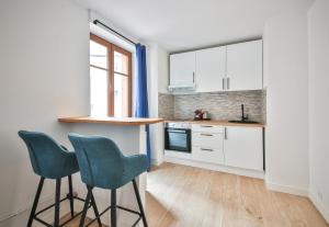 La zona cucina è completamente attrezzata: dispone di piano cottura elettrico con piastra riscaldante, forno a microonde, macchina per il caffè e bollitore elettrico. I pavimenti in legno contribuiscono a creare un’atmosfera calda ed elegante, la biancheria da letto è fornita per garantire comfort durante il soggiorno.