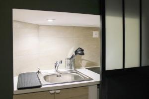 Внутри студии есть компактная кухня с микроволновой печью, холодильником и всем необходимым для приготовления пищи посудой. Для любителей кофе предусмотрена кофемашина. Зона отдыха оборудована столом для удобства гостей. Санузел оснащён душевой кабиной и феном.