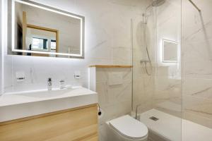 The apartment features two bedrooms and two bathrooms equipped with showers and hair dryers. Guests can prepare meals in the fully equipped kitchen, which includes a toaster, coffee machine, electric kettle, refrigerator, and kitchenware. The living area provides seating on a sofa bed alongside a table for dining or work. A TV is available for entertainment.