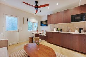 Nedávno zrekonstruovaný byt má samostatnou ložnici a koupelnu s prostorným walk-in sprchovým koutem. Obývací pokoj je vybaven pohodlným posezením a televizí s plochou obrazovkou, zatímco kuchyň disponuje troubou, mikrovlnnou troubou a jídelním stolem - ideální pro přípravu domácích jídel. Podlaha v obytné části je pokryta dřevěným parketem, který dodává prostoru teplý charakter.